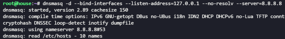 dnsmasq -d --bind-interfaces --listen-address=127.0.0.1 --no-resolv --server=8.8.8.8本地做解析: