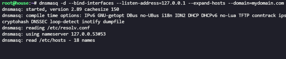 --expand-hosts 参数可以支持对 hosts 文件中的主机名,添加域名后缀的解析,使用 --domain=<domain> 参数指定后缀,比如上例中,如果添加参数 --expand-hosts --domain=mydomain.com ,那么解析 house 或者 house.mydomain.com 都会返回 hosts 文件中的配置。