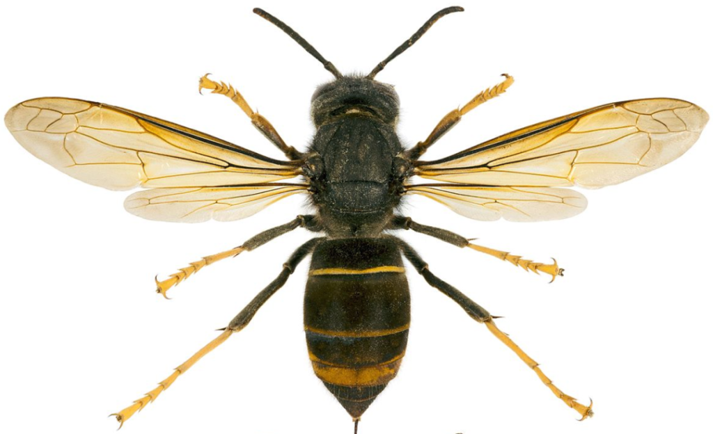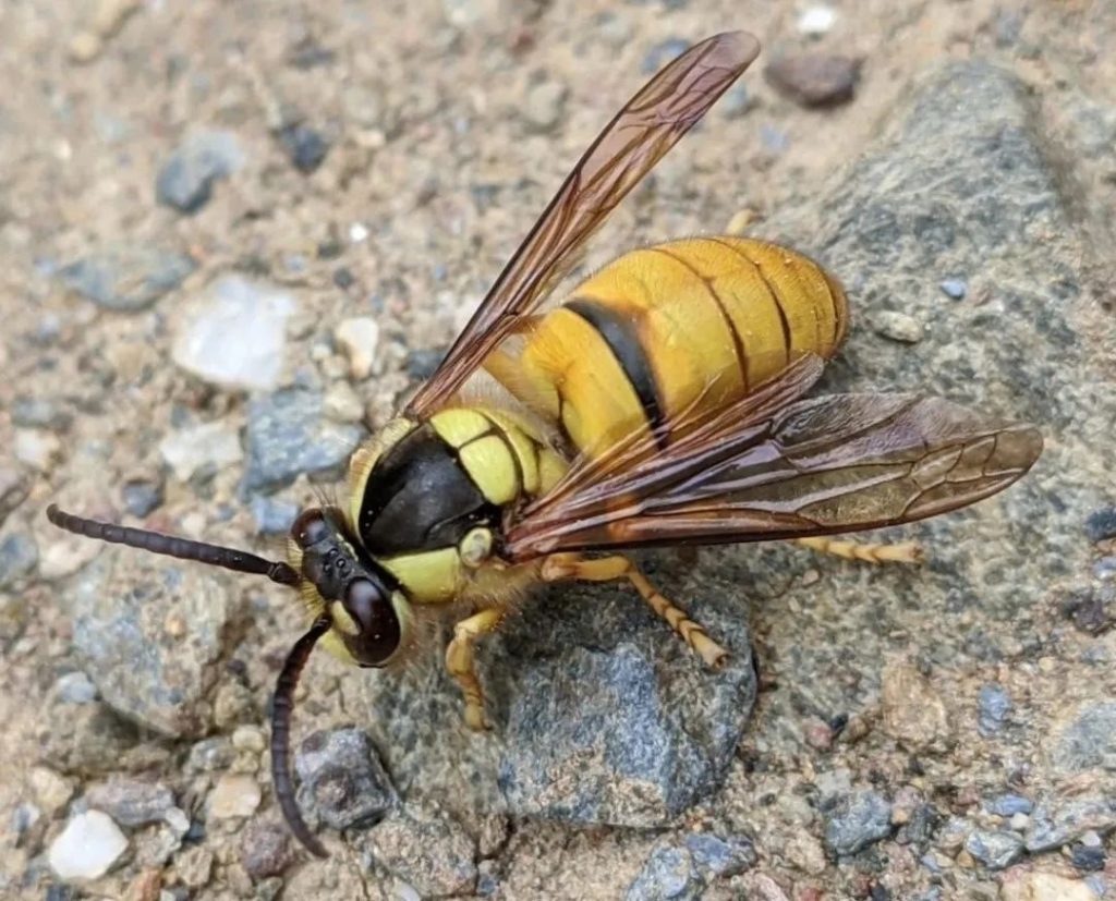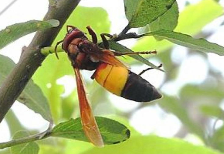 金环胡蜂:俗称:“虎头蜂”,“大土蜂”,体型较大,30-35mm,最大45-50mm,显著特点为:头部黄色,远看像老虎头,中胸背板黑色,腹部桔黄色具有金黄色环纹。