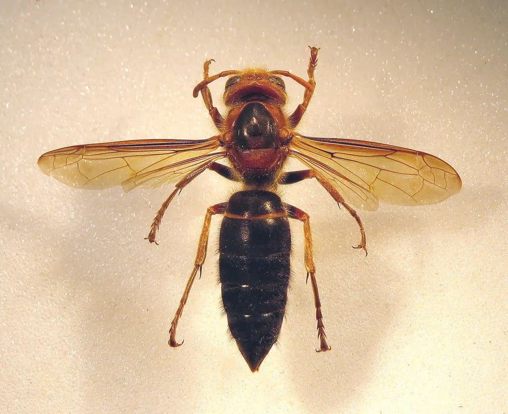 黑绒胡蜂,别称:黑腹虎头蜂、黑绒虎头蜂,体型较大,胸部背板红黑色且腹部为深黑色,身上绒毛较多。