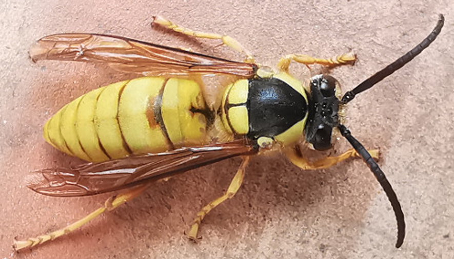 黑盾胡蜂,又称双色胡蜂,黄色胡蜂,体细,黄色,或红黑色,胸部有黑色小盾片